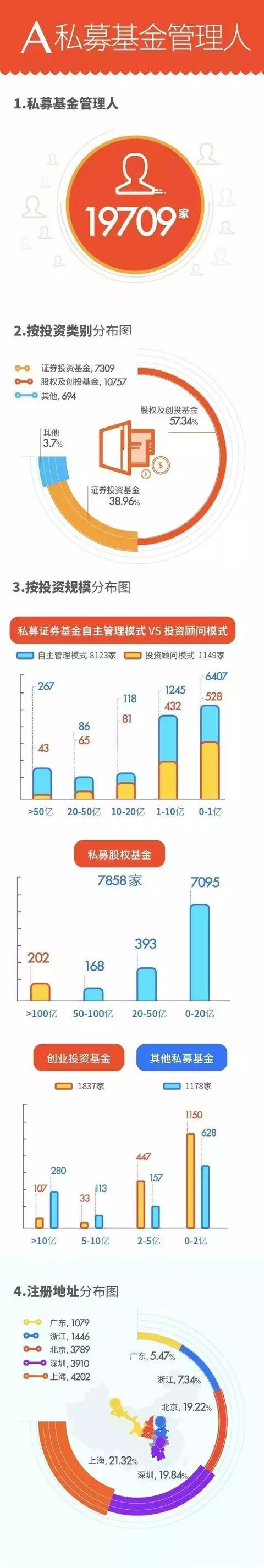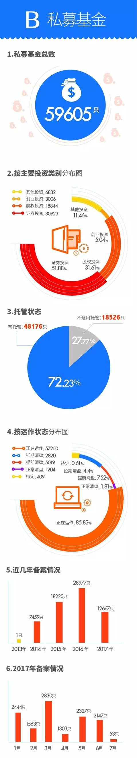 截止6月底,中基协数据统计显示,私募基金管理人共计19709家,同比增长221家,增长率为72.94%;环比增长136家,增长率为35.05%;私募基金数量共计66702只,同比减少336只,增长率为-57.1%;环比减少180只,增长率为-7.74%。