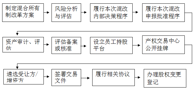 国企混改,按照上图的介绍,一般包括制定混合所有制改革方案、进行风险分析与评估、履行内部决策程序、履行混改申报批准程序、开展审计评估、进行评估备案或核准、设立员工持股平台(若有)、在产权交易中心实施产权交易、遴选战略投资者、签署交易文件、履行相关协议、办理股权变更登记等主要步骤。其中具体流程如下: