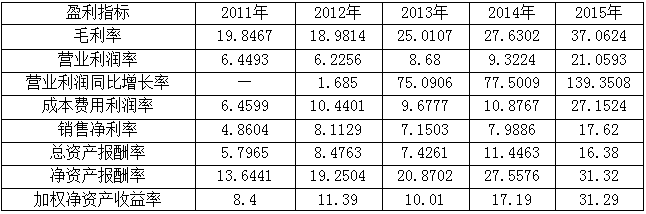 通过表中的数据显示,表中的各项数据指标的波动较大,且四个指标的变动趋势呈现出不同的状态。总资产增长率在2013年增长较大,主要为流动资产占比较大,存货和预付账款较多,符合公司行业特点。而在2014年公司的各项资产增长幅度较小保持了平稳发展,在2015年又出现了较好的趋势。通过后三个的增长率变动可以看出2012年的净利润增长以及2014年净利润的增长与营业利润增长差较大,这主要是由于2011年和2014年分别补缴了2009年和2010年的税以及滞纳金,使得营业外支出较大。招股说明书中解释为在2011年前公司的会计制度并不健全,核算不够规范,因此公司进行了纳税调整。同时值得关注的是,2015年公司的营业收入增长率只有5.95%,但是公司的净利润却增长133.75%,通过招股说明书中看到这主要是因为公司在2015年的成本大幅度压缩,原材料的成本下降导致的。综上所述,近五年中公司的发展一直在朝着较好的趋势发展,各项指标均能保持一定的增长,净利润的增长率大部分可以来源于主营业务。因此,私募股权投资的注入首先证明了公司的未来发展是较好的,前景较为光明,尽管在这五年中行业有萎缩的时候但是公司能够在PE的指导与监督下保持良好的发展。