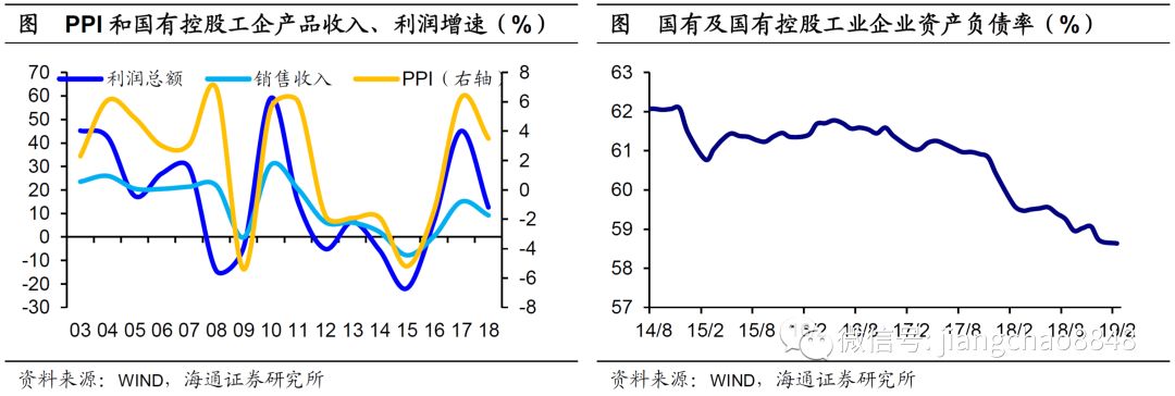 本轮国企改革同样面临产业结构升级大背景下的经济下行、产能出清等问题,同样需要在供给端做减法,在改善工业供需格局的同时,降低国企债务,这与第二轮国改颇为相似。事实上,随着16、17年去产能政策的落实,工业供需格局得到改善,国企产能利用率、收入利润率大幅提升,同时也带动工业品价格大涨,两者共同带来国企收入、利润的明显改善。而随着17、18年去杠杆由金融领域转向实体经济领域,融资端的持续收缩倒逼国企降低负债率,而减轻债务负担也令国企轻装前行。