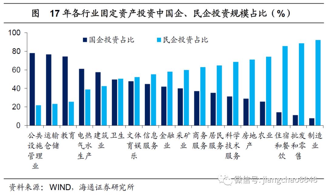 由于民企规模普遍低于国企,民企和国企在投资规模上的差异要远胜于数量上的差异。从17年固定资产投资数据看,除去水利和公共设施管理、电热气水生产供应和交运仓储等传统基建行业以外,教育、建筑业等行业的国有资本投资也都普遍高于民企投资,而卫生、文体娱乐、信息服务业则基本持平。