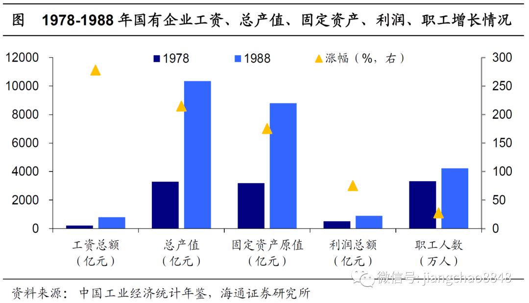 这一时期,国有企业实现了全方位的规模扩张。从投入看,国企职工人数从78年的3300万人上升到88年的4200万人,职工工资总额从210亿元上升至790亿元,固定资产原值从3200亿元上升到8800亿元。从产出看,国企总产值从78年的3300亿元飙升至1.04万亿元,利润总额也从510亿元上升至890亿元。不过,值得注意的是,这一时期,国企员工工资总额涨幅2.8倍,超过2.1倍的产值涨幅,更远超75%的利润增幅,而国企职工人数涨幅不到30%,这意味着效率的提升远不及规模的提升。