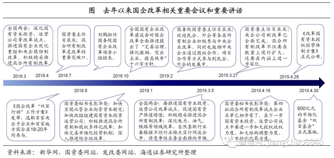 去年初以来,国企改革相关政策频频出台。国资委主任肖亚庆曾在去年4月的博鳌亚洲论坛18年年会上提出,混合所有制改革是我们改革的一个重要突破口。7月国办发布通知,由刘鹤担任国有企业改革领导小组组长,他在10月的全国国有企业改革座谈会上提出了国企改革“完善治理、强化激励、突出主业、提高效率”十六字方针。总理在今年3月全国两会《政府工作报告》中再次强调要“推进国有资本投资、运营公司改革试点,促进国有资产保值增值,积极稳妥推进混合所有制改革”。发改委副主任连维良则在两会记者会上强调,今年将推出第四批100家以上的混改试点。在完全竞争领域推行混改,并允许社会资本控股。