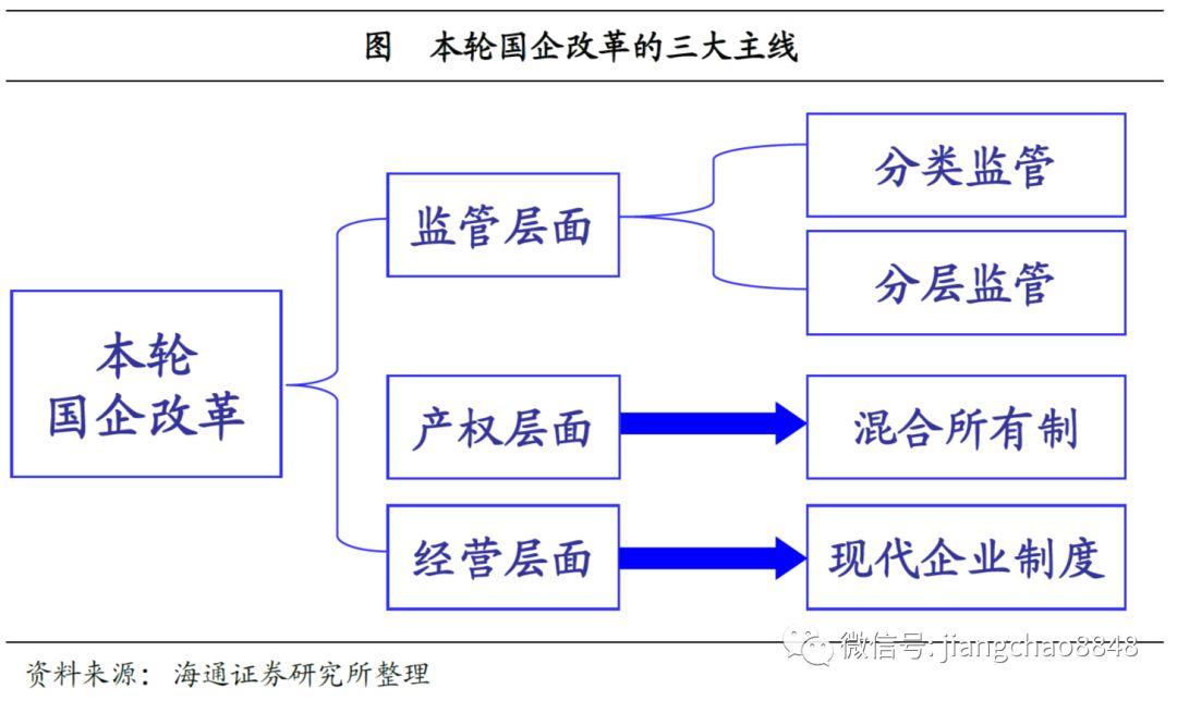 本轮国企改革的三大主线。首先是在监管层面,强调分类监管和分层监管,底线是坚持党的领导,国有企业将被划分为公益类、特定功能类和竞争类,采用不同方式进行改革,同时设立国资委、国有资本管理公司、经营性国企三个层次进行监管。其次是在产权层面,底线是防止国有资产流失,强调混合所有制改革,而国有资产证券化、引入战略投资者和社会资本、推广员工持股和股权激励等将成为重要手段。第三是在经营层面,通过建立现代企业制度,提升企业经营绩效,实现“做强做大”国企。
