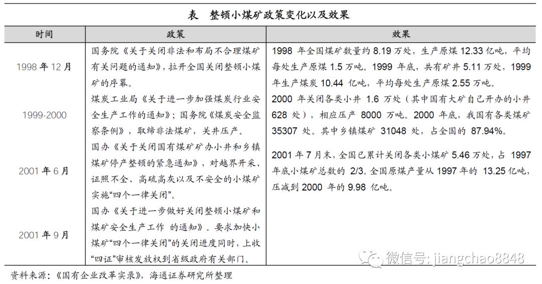 在98-02年,上游的煤炭行业也同样面临严重的产能过剩。由于监管不力、管理失控,到98年,仅乡镇煤矿最多曾达到8万多个,产量占全国总产量的43%还多,扰乱了正常的煤矿生产和经营秩序,对国有大矿造成了严重冲击。为此,国务院决定从98年11月开始对小煤矿实施关井压产。到01年7月末,全国累计关闭各类小煤矿5.46万处,占97年底小煤矿总数的2/3。全国原煤产量从97年的13.25亿吨压减到2000 年的9.98亿吨。98-02年,政府出手治理整顿小煤矿,平滑了煤炭行业供给的较大波动,也是煤炭行业得以稳定的最大因素之一。