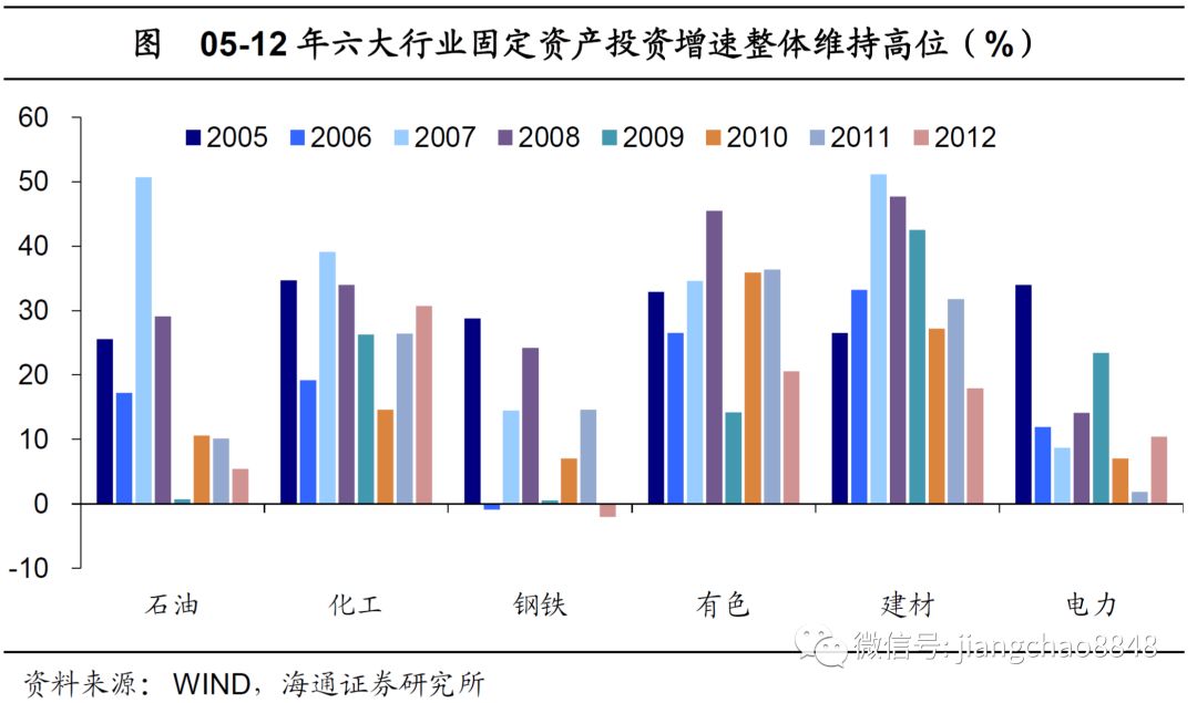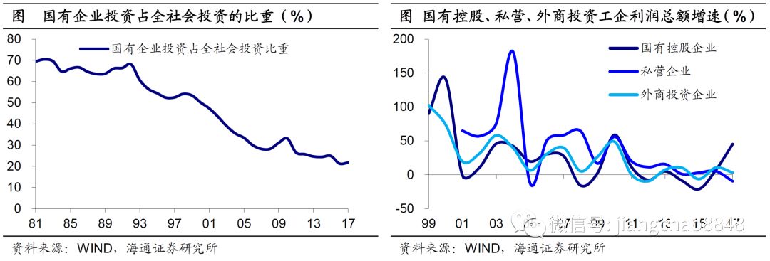 2003年,国资委正式成立,提出国有企业进行了以股份制为主要形式的现代产权制度改革。经济周期上行、产业结构升级,叠加生产效率提高,令国企在资产规模大幅扩张的同时,盈利能力也有所增强。因而,一方面,在03-12年间,国资占比较高的石油、化工、钢铁、水泥、建材、电力等传统重化工业,其固定资产投资整体保持较高增长;另一方面,也正是由于国企“抓大放小”,民营经济经历了从无到有、从小到大的跨越式发展,对经济增长的贡献也与日俱增,目前贡献了50%以上的税收、60%以上的GDP、70%以上的技术创新和新产品开发、80%以上的就业和90%以上的企业数量。