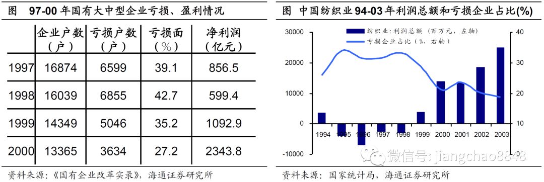 国有控股工业企业职工人数从93年最高的4500万人持续收缩至07年的1750万人,国有中小企业的数量从95年的31.8万家降至06年的11.6万家。而大中型国企亏损面从98年最高的42.7%降至00年的27.2%,净利润从600亿元回升至2300亿元,包括纺织行业在内的五个重点行业整体扭亏为盈。