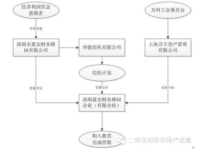深圳市盈安财务顾问有限公司成立后,组建深圳盈安财务顾问企业(有限合伙),形成投资主体。其普通合伙人为深圳市盈安财务顾问有限公司,有限合伙人为上海万丰资产管理有限公司(万科工会委员会的全资子公司),以及华能信托有限公司,这三家的实际控制人均为万科。
