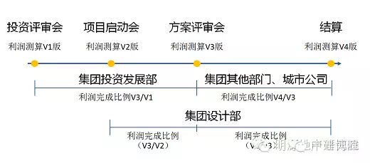 从上图可以看出,A企的利润测算主要分为四个版本,分别是拿地版V1(投资评审会通过),概念版V2(项目启动会通过)、方案版V3(方案评审会通过)以及最终的结算版V4(结算完成),这样设置的目的主要是为了更好的匹配上述四大主体的管理要求,实行差异化的激励与约束,具体如下: