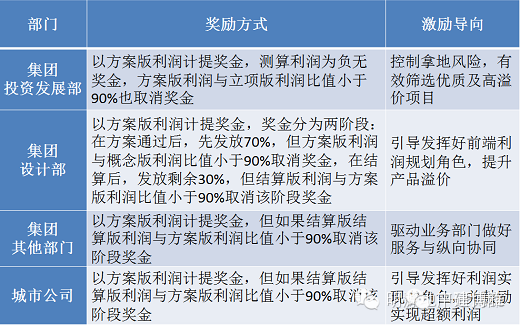当前行业常见的奖金分配方式,一般是按照销售额或利润总额的固定比例提成或者跳点提成,先形成分配的大蛋糕,然后再在总部和项目间进行二次分配。这种方式的缺陷在于无法对各部门(特别是投资、设计、项目)在项目价值链中的利润贡献形成差异化的引导与约束,比如设计部门,怎么引导和约束其发挥好前端利润规划的角色,做好设计,提升产品溢价呢?