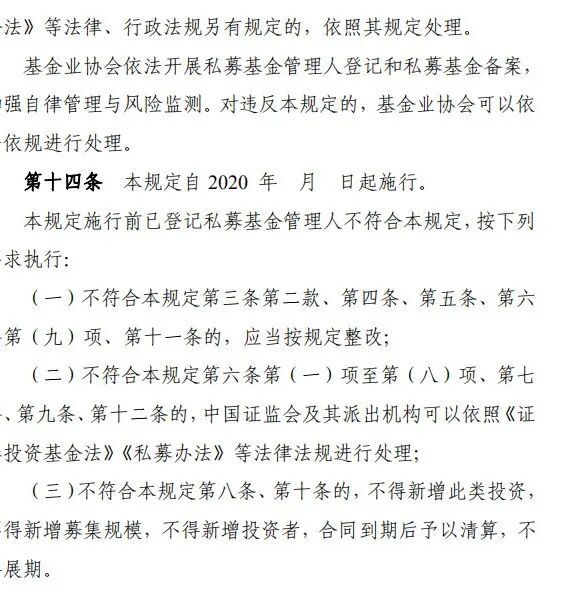 第十四条 本规定自2020年月日起施行。本规定施行前已登记私募基金管理人不符合本规定,按下列要求执行: