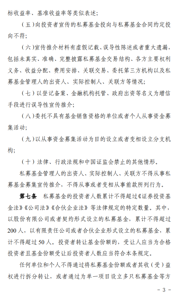 第七条 私募基金的投资者人数累计不得超过《证券投资基金法》《公司法》《合伙企业法》等法律规定的特定数量。其中,以股份有限公司或者契约形式设立的私募基金,累计不得超过200人,以有限责任公司或者合伙企业形式设立的私募基金,累计不得超过50人。投资者转让基金份额的,受让人应当为合格投资者且基金份额受让后投资者人数应当符合本条规定。