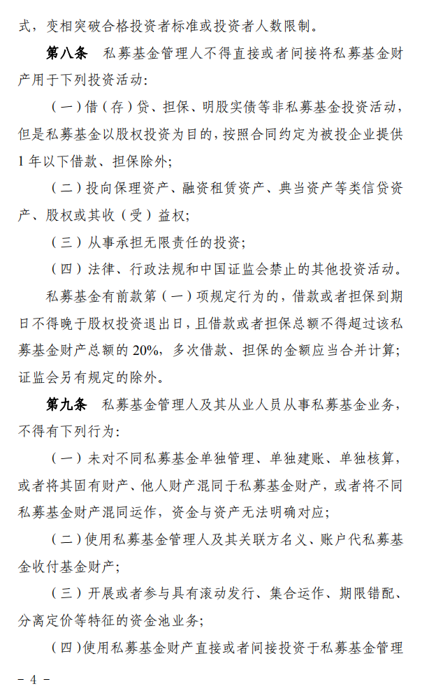 第四条 私募基金管理人不得管理未依法备案的私募基金,不得直接或者间接从事民间借贷、担保、保理、典当、融资租赁、网络借贷信息中介、场外配资等任何与私募基金管理相冲突或者无关的业务。