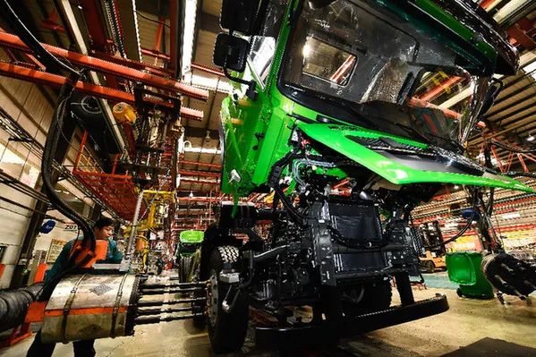 工人在中国重汽集团济南商用车有限公司整车装配生产线上作业。记者 郭绪雷 摄