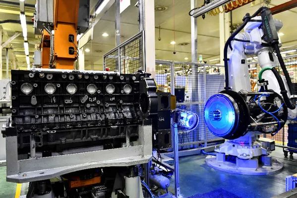 在位于山东潍坊的潍柴集团总装车间,机器人在流水线上装配发动机。记者 郭绪雷 摄