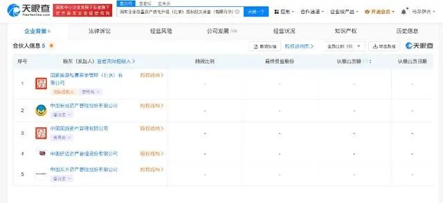 中国经济周刊-经济网讯 天眼查App显示,近日,国有企业存量资产优化升级(北京)股权投资基金(有限合伙)成立,出资额400亿人民币,经营范围为以私募基金从事股权投资、投资管理、资产管理等活动,企业管理咨询。合伙人信息显示,该基金由中国国新资产管理有限公司及旗下国新盛康私募基金管理(北京)有限公司,以及中国长城资产管理股份有限公司、中国信达(HK.01359)、中国东方资产管理股份有限公司共同出资。