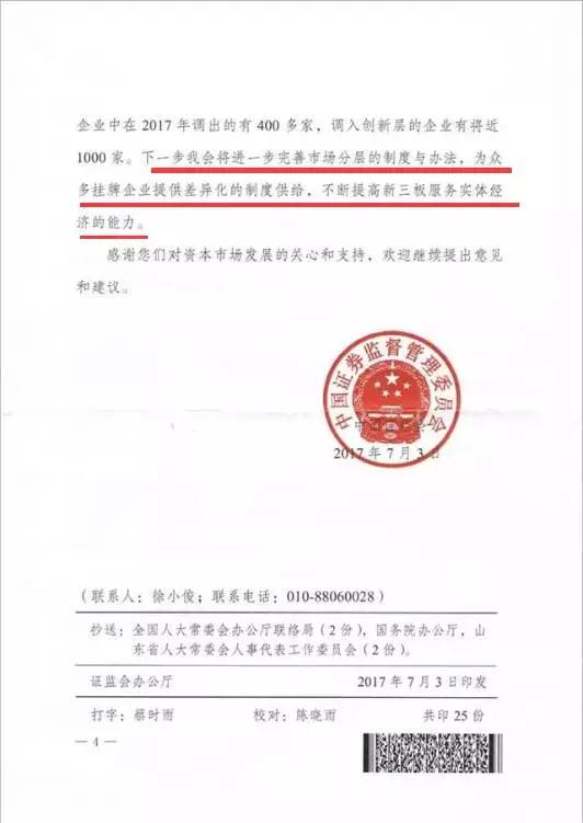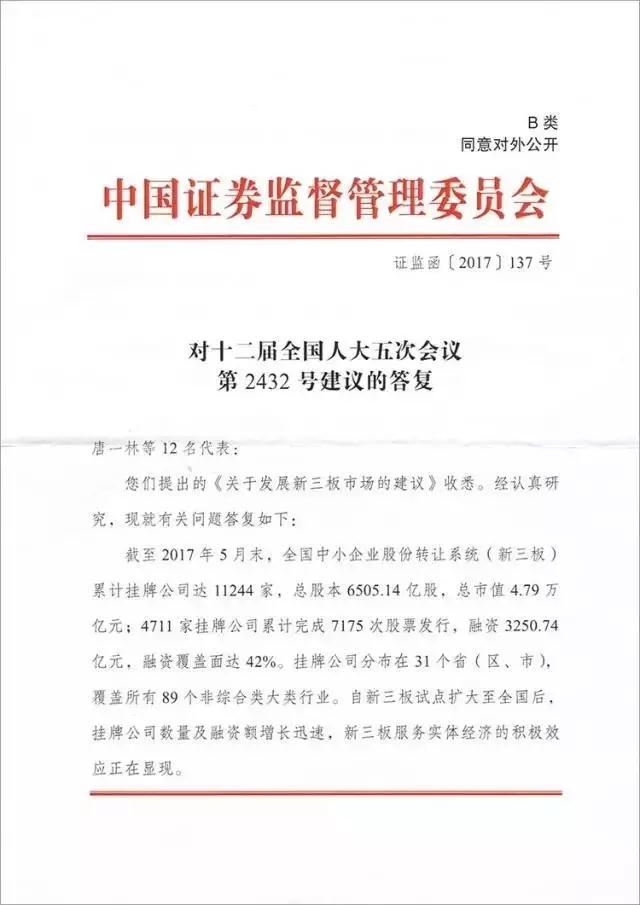 对唐一林等人大代表的建议,2017年7月,证监会正式书面答复。
