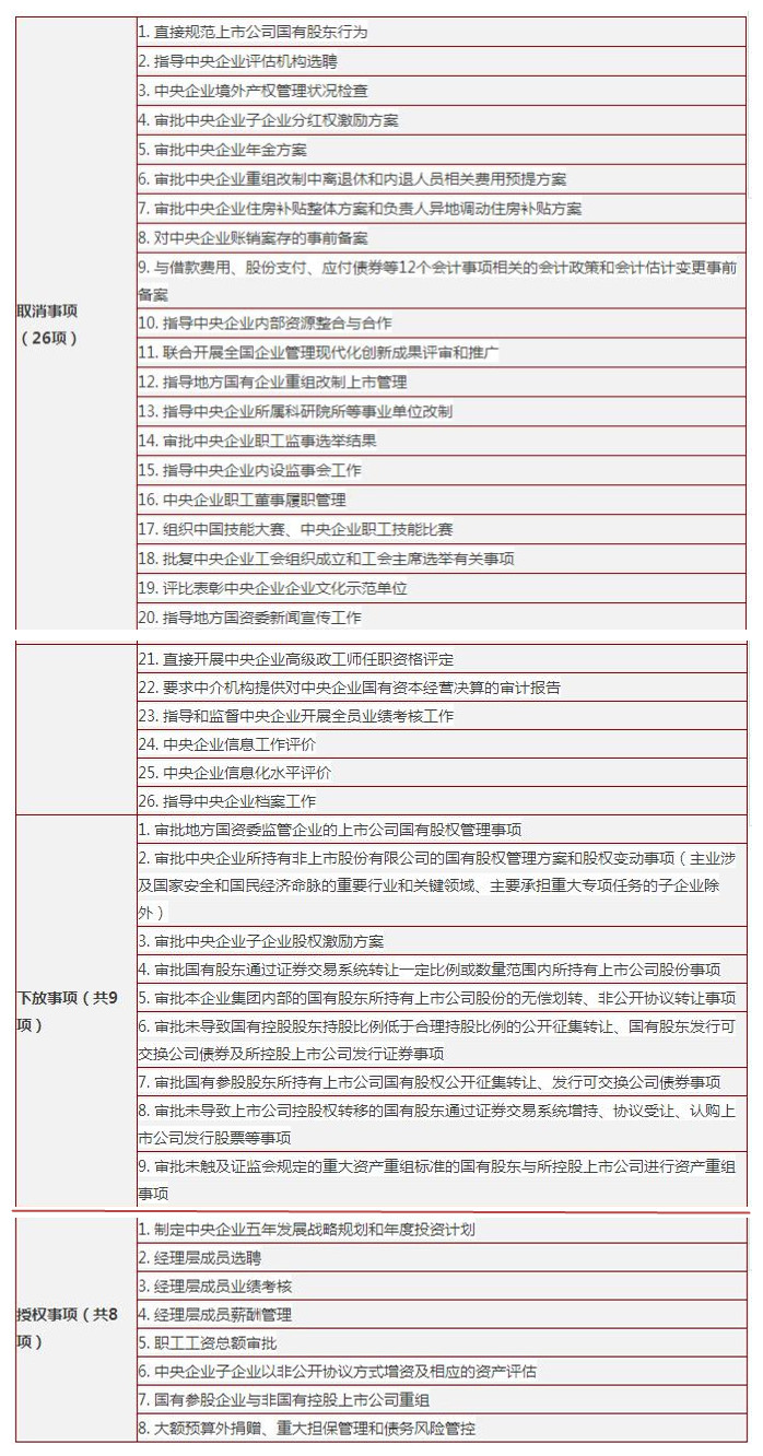 坚持问题导向、试点先行提出解决措施。《方案》坚持问题导向,着眼国有资产管理体制中政企不分、政资不分问题依然存在,国有资产监管还存在越位、错位、缺位的现象,提出将精简43项监管事项,其中取消事项26项、下放事项9项、授权事项8项。在26项取消事项中,取消了国资委直接实施事项,如直接规范上市公司国有股东行为,中央企业境外产权管理状况检查等;取消了国资委审批类事项,如审批中央企业子企业分红权激励方案,审批中央企业重组改制中离退休和内退人员相关费用预提方案;取消了指导类事项,包括对中央企业的指导事项,如指导中央企业评估机构选聘、指导中央企业内设监事会工作、指导地方国资委新闻宣传工作,指导地方国有企业重组改制上市管理;取消了评比类事项,如联合开展全国企业管理现代化创新成果评审和推广,组织中国技能大赛、中央企业职工技能比赛。9项下放事项,主要集中于资本市场的股权交易和股权管理。涉及地方国资委监管企业和中央企业子企业的国有股权流动事项,直接下放给地方国资委和中央企业。涉及规定标准和权限范围以内的国有出资企业股权流转的,下放给国有出资企业。如审批未导致上市公司控股权转移的国有股东通过证券交易系统增持、协议受让、认购上市公司发行股票等事项,审批未触及证监会规定的重大资产重组标准的国有股东与所控股上市公司进行资产重组事项等。8项授权事项,主要落实董事会职权。涉及制定中央企业五年发展战略规划和年度投资计划、经理层成员选聘、业绩考核和薪酬管理。落实“以管资本”为主的国资管理体制的核心管理职责:国有股东代表管理以及在此管理职责基础上派生出来的股东代表、董事、监事及职业经理人的管理。