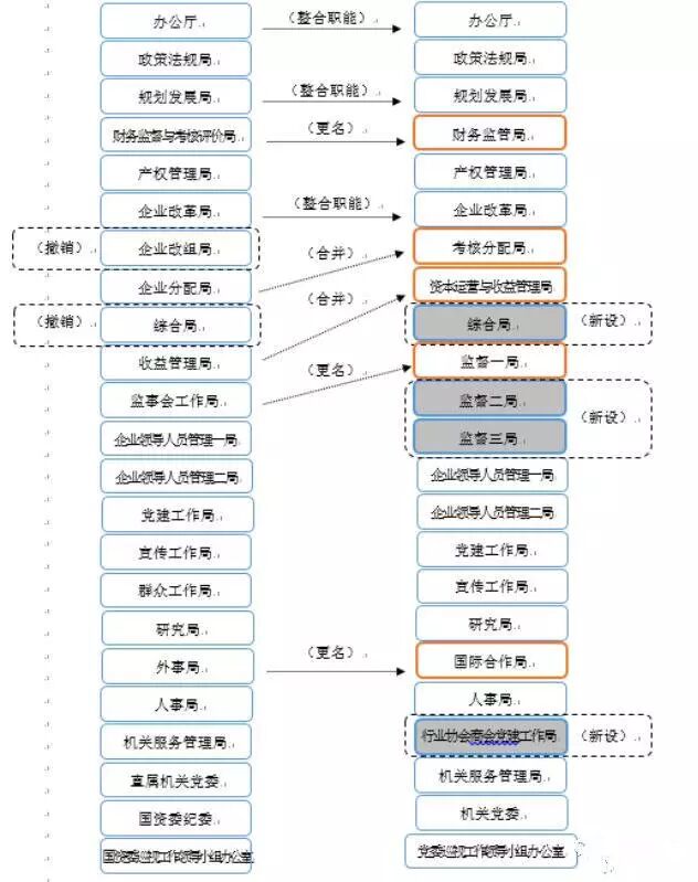 整合有关工作事项,提升国资监管工作效能。设立新的企业改革局,将企业重组整合、结构优化、改制上市以及解决国有企业历史遗留问题等工作有机结合,着力加大对企业改革改制的分类指导、推动和服务力度,进一步形成深化国有企业改革的合力;新设综合局,整合指导企业开展科技创新、知识产权管理与保护、加强品牌建设等职能;将财务监督与考核评价局更名为财务监管局,在加强对中央企业财务监管的同时,统一开展财务动态监测和经济运行分析工作,为国有资产监管工作提供基础支撑;将外事局更名为国际合作局,进一步加强国际交流与合作。
