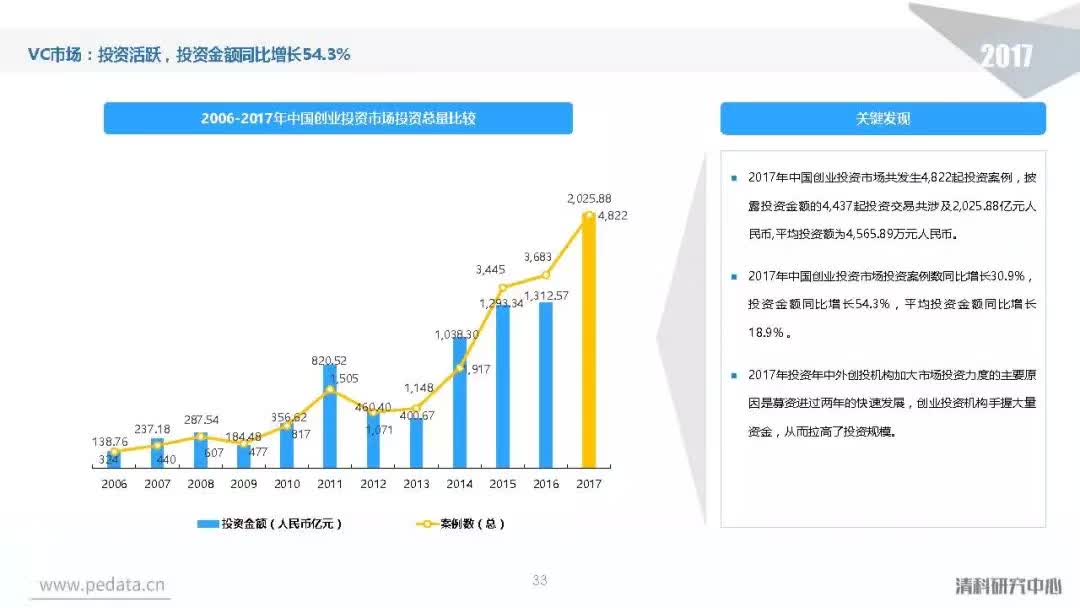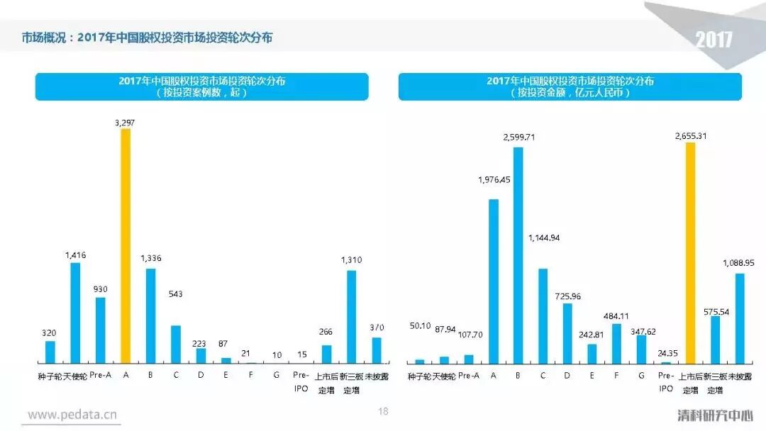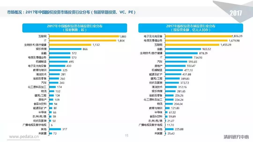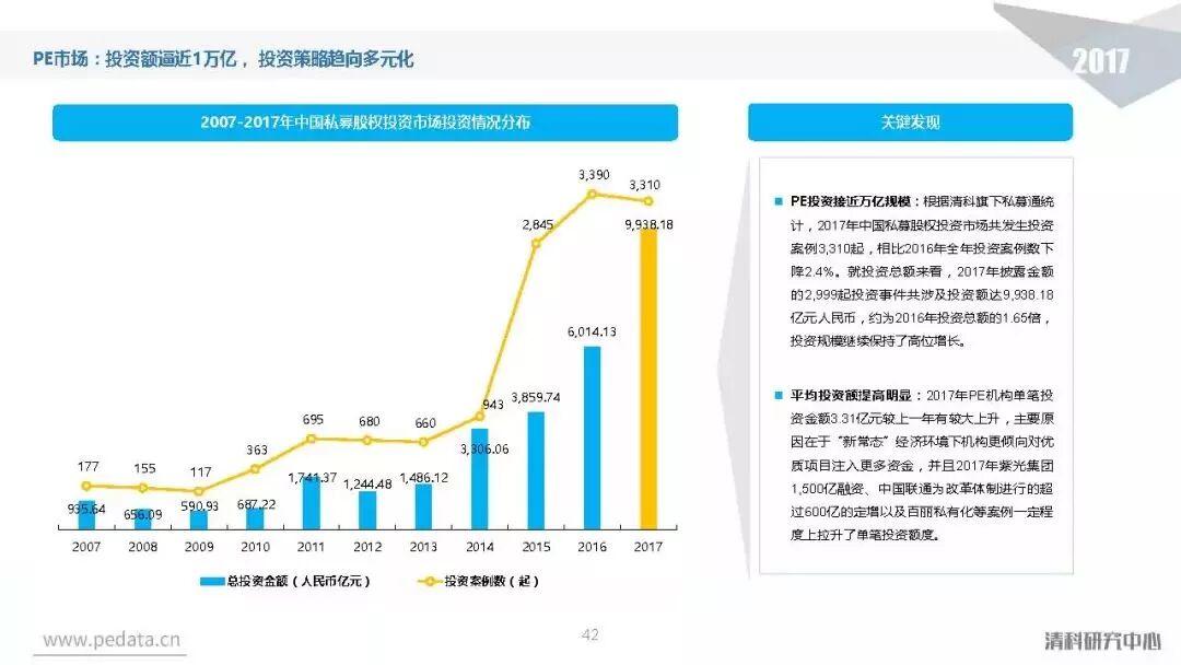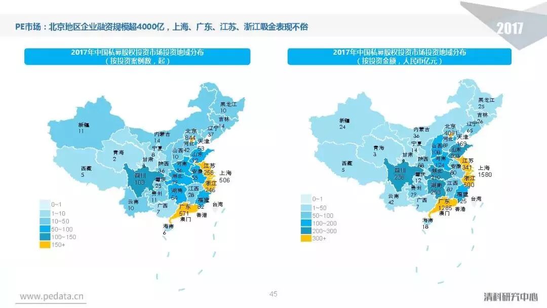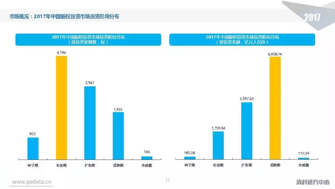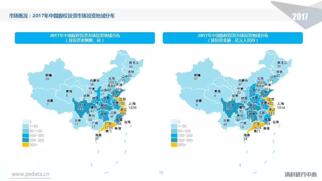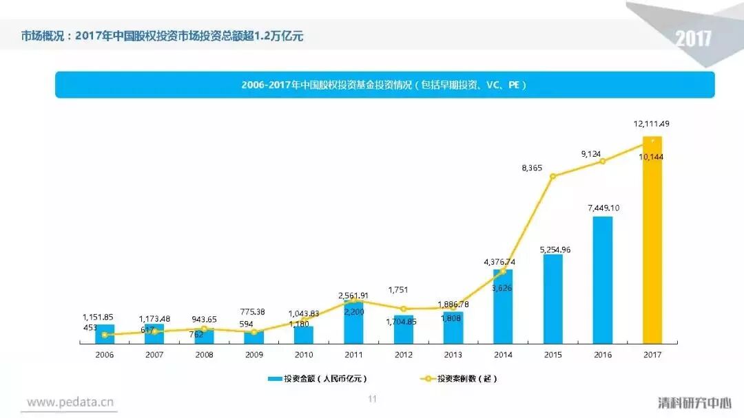 投资方面,2017年中国股权投资市场共发生投资案例数量10,144起,涉及投资金额合计达到1.2万亿元人民币,同比分别增长11.2%、62.6%。