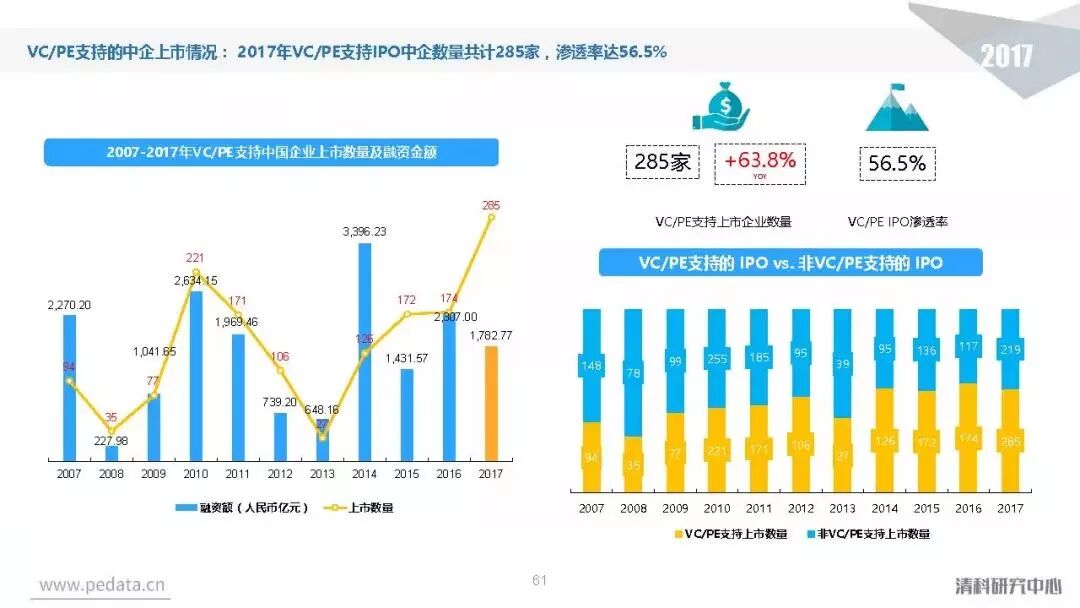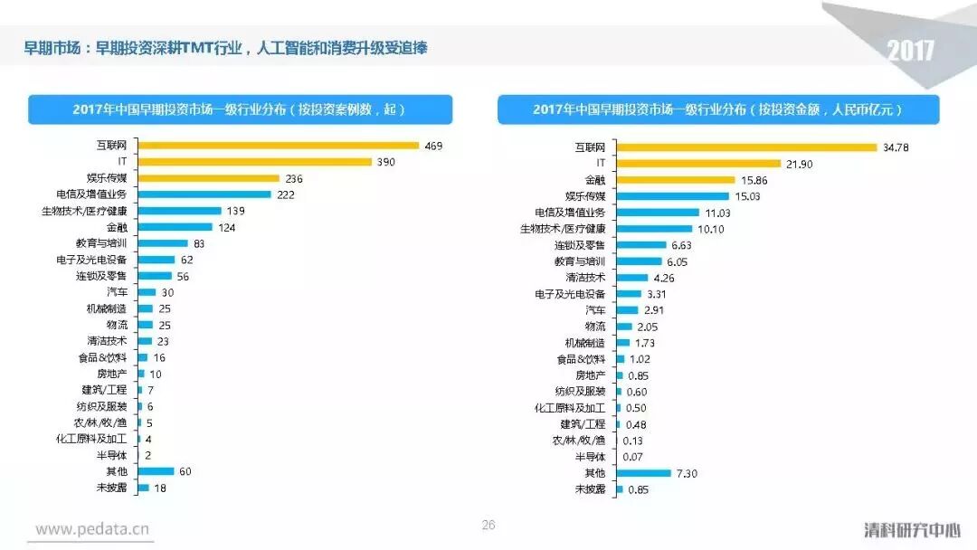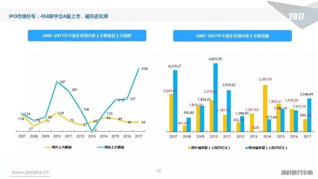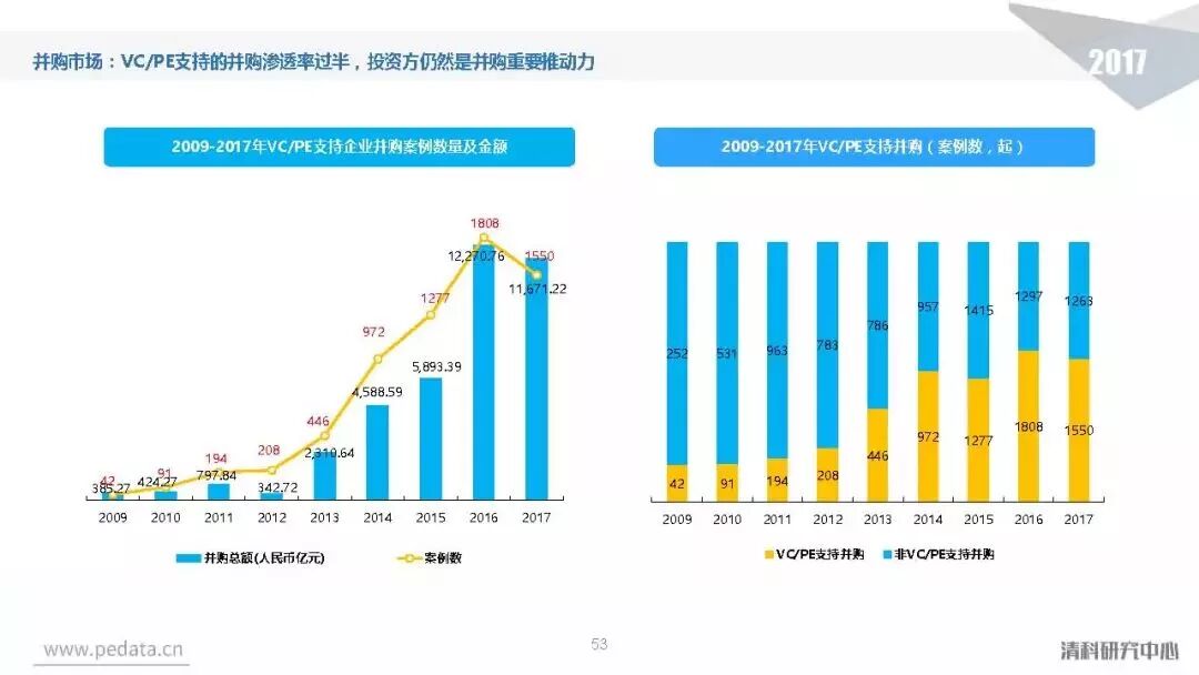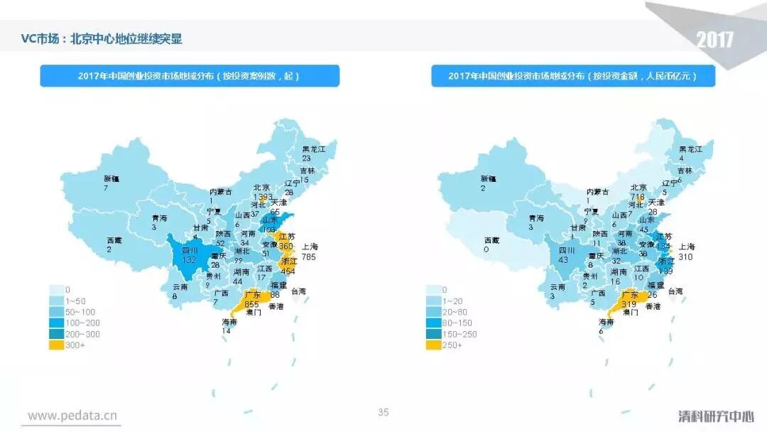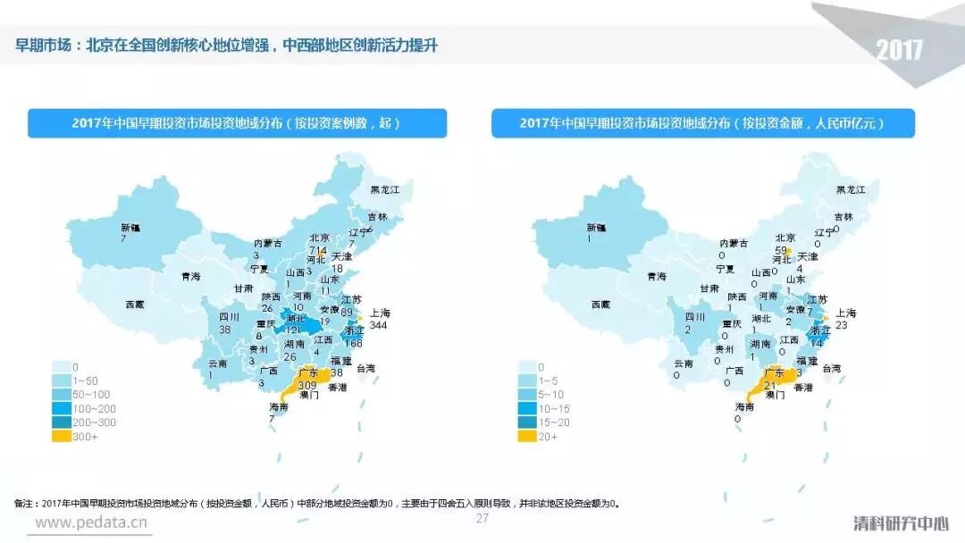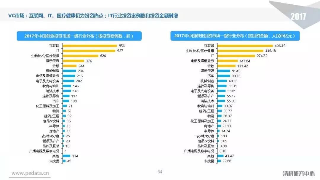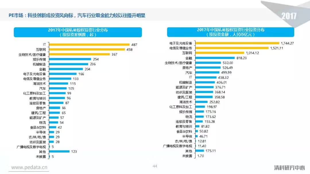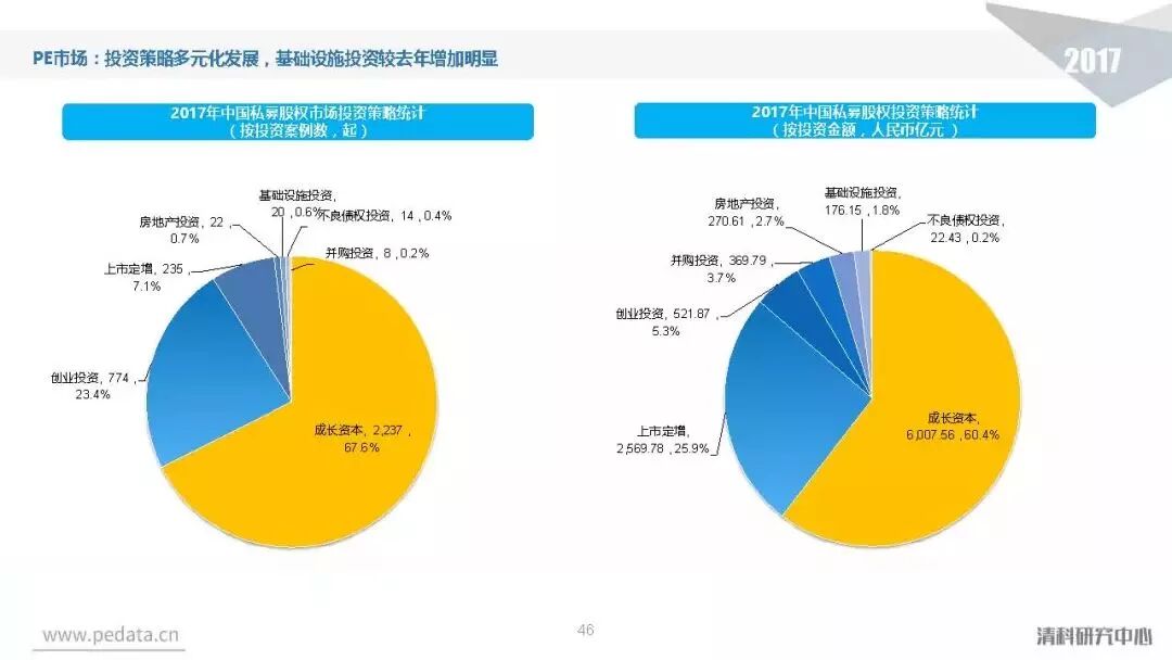投资方面,2017年中国股权投资市场共发生投资案例数量10,144起,涉及投资金额合计达到1.2万亿元人民币,同比分别增长11.2%、62.6%。