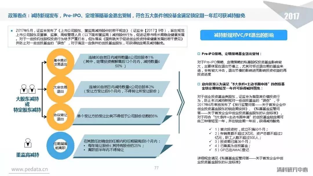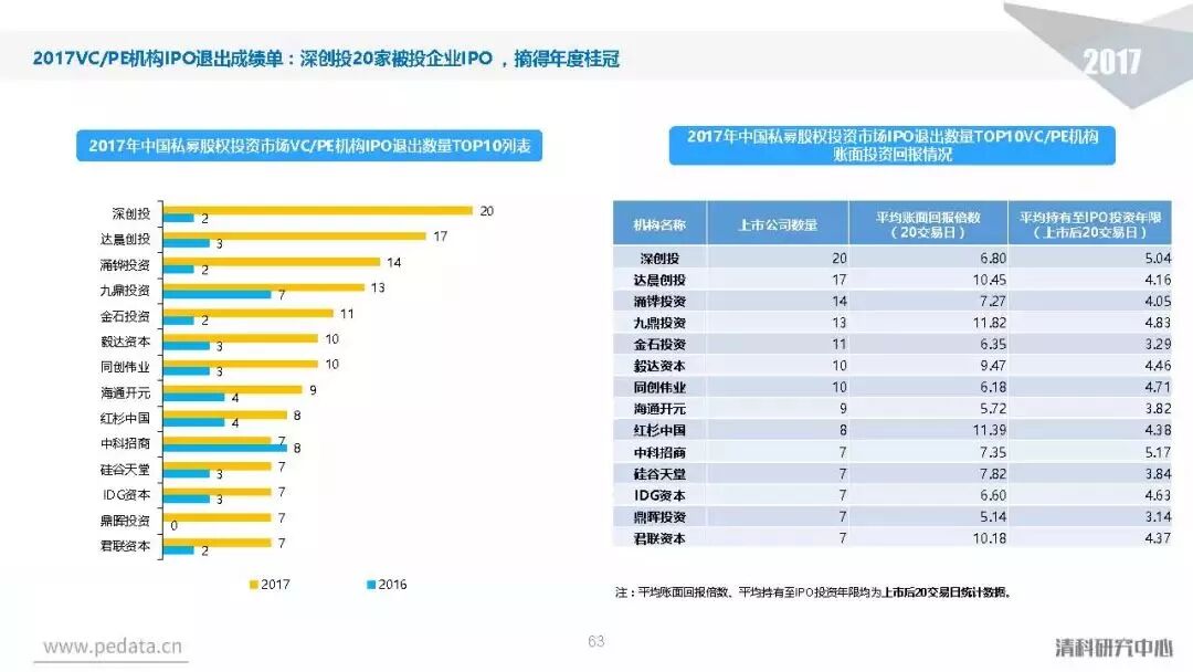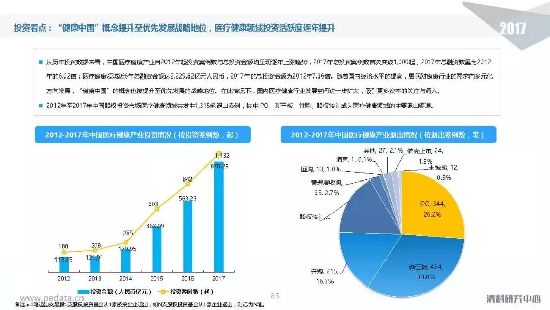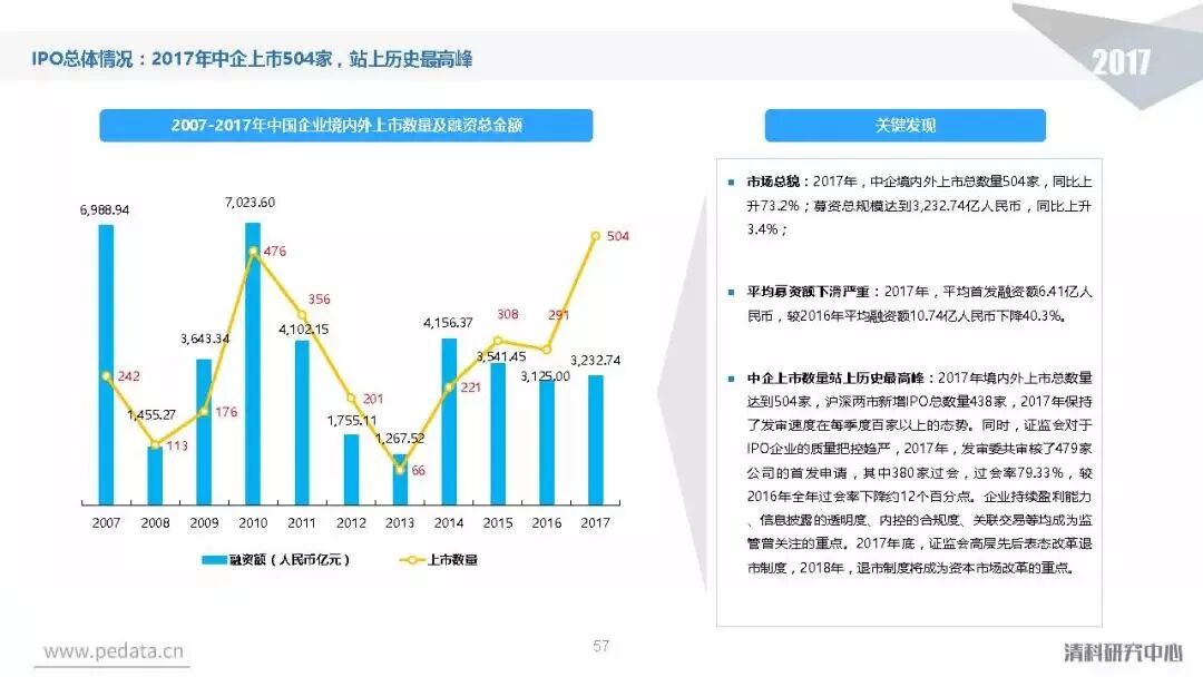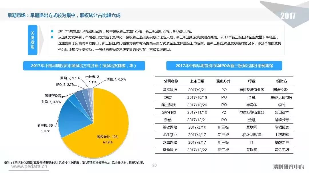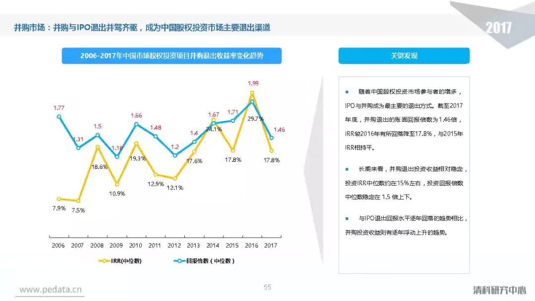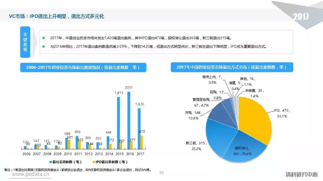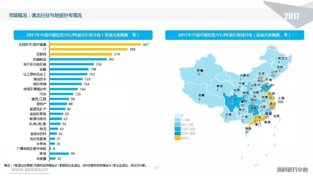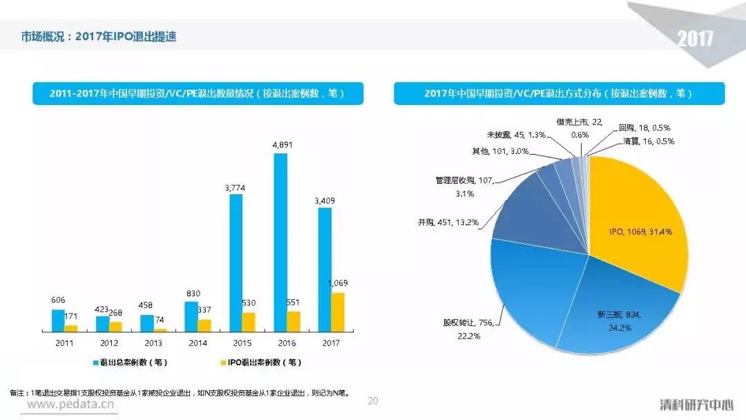 退出方面,2017年中国股权投资基金退出案例数量达到3,409笔,其中IPO退出案例数量1,069笔,占比达到31.4%,在今年IPO审核加速的利好影响下,私募股权投资市场IPO退出总量同比提升94.0%。