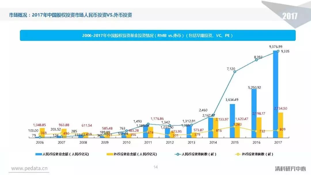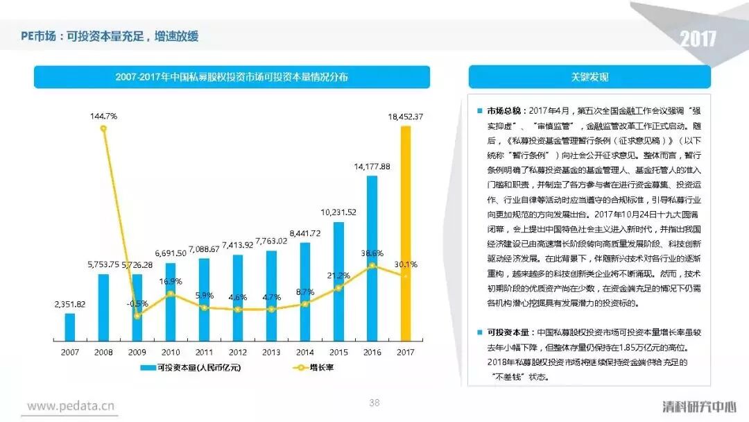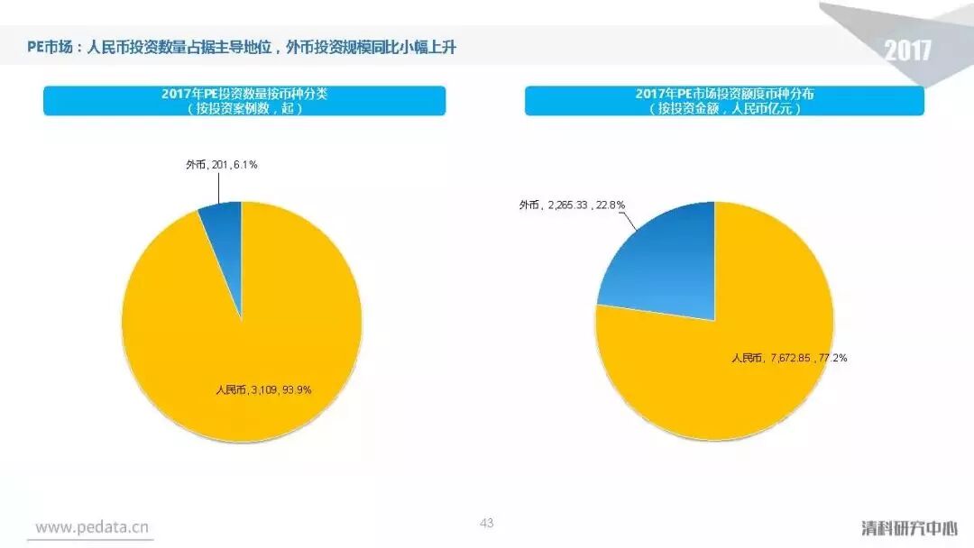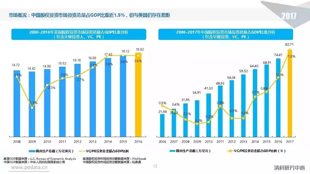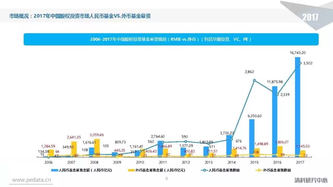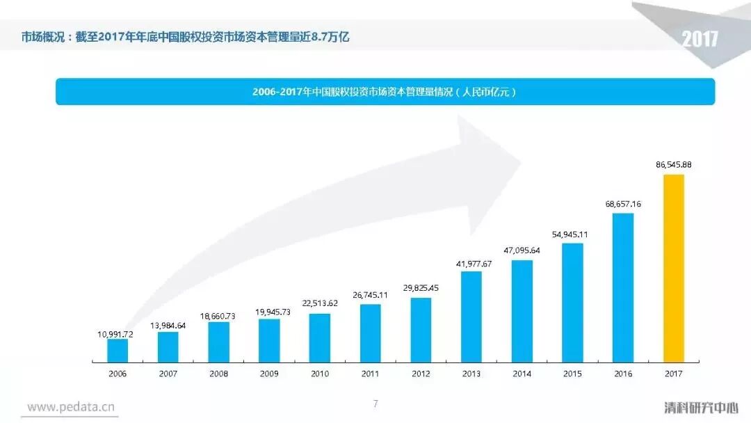 截至2017年底,中国股权投资市场资本管理量接近8.7万亿人民币,人民币基金在中国股权投资市场的主导地位愈加明显。