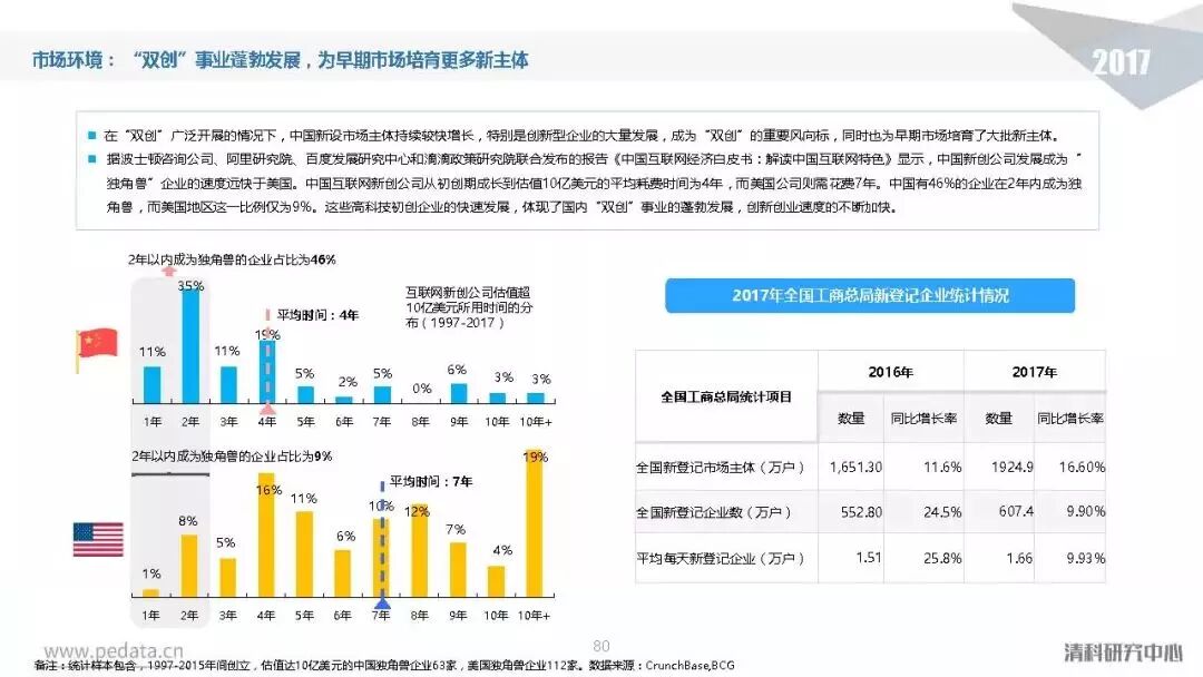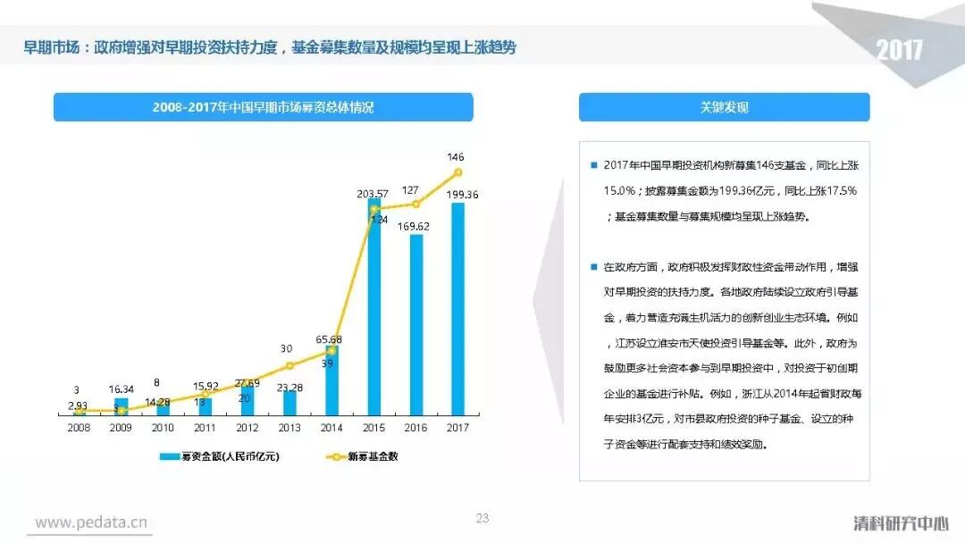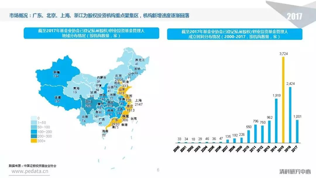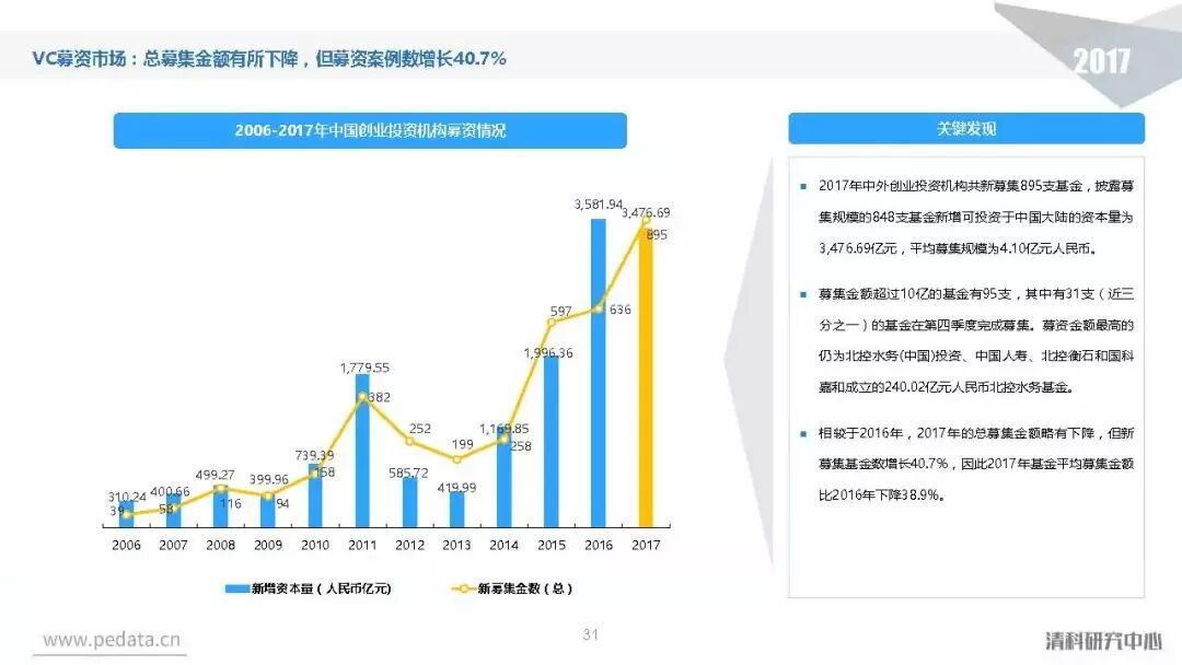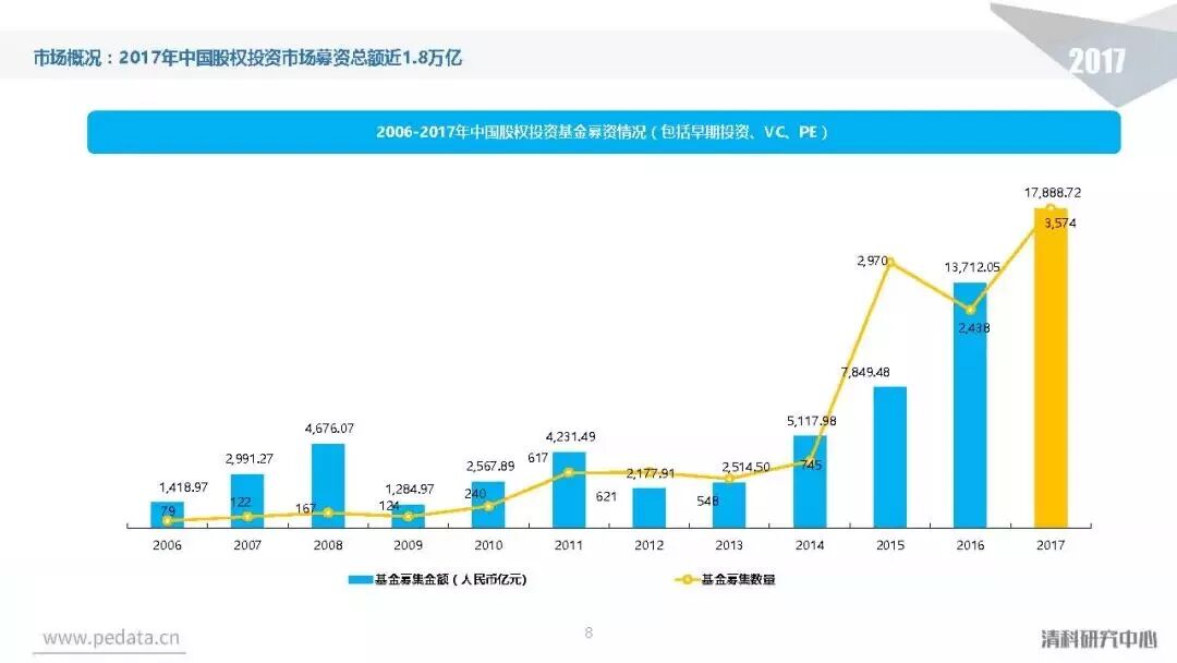 根据清科旗下私募通数据统计,2017年中国股权投资市场共新募集3,574支基金,已募集完成基金规模近1.8万亿元人民币,同比增长分别达到30.5%、46.6%。