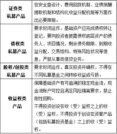 对债权类产品,要求封闭运作,基础资产应完成债权转让登记,要向投资者披露债权底层资产的债务人、项目情况、剩余债务期限、到期收益分配、交易结构、特殊风险状况等信息,严禁从事类信贷业务;对股权/创投类产品,要求封闭运作,真实投资并确权,不得在不同私募基金之间转移收益或亏损;