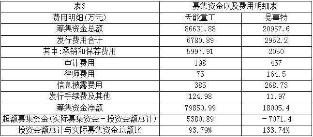 天能重工和易事特募集资金的用途都是用于主营业务,而天能重工还包括流动资金。通过上面的数据显示,具有私募股权投资的天能重工实现了超额募集资金,而对比公司则出现了投资金额小于募集资金的现象。而就费用相比,因为易事特的上市年份为2014年,而天能重工则在2016年上市两年的时间差会导致第三方的中介费用有所差异。但是,明显可以看出的是天能重工的承销和保荐费用是易事特的2倍,这可能与目前市场上的宏观经济和市场行情有关。但是审计费用和律师费用确是对比公司的一半,可以看出第三方中介费用的差距较为明显,但是与私募股权投资的作用并无从考量,其认证作用无法直接得到证实。但是可以看出的是有私募股权投资的公司有利于资金募集,并能缩短目标公司的IPO的筹备期。