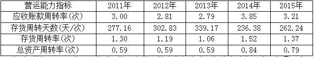 如表6数据显示,对于天能重工的四个营运能力指标在这五年中变动都不大,但是三者呈现出相同的变化趋势,均为先下降后上升再下降。下降的主要原因为:受宏观经济的影响,公司的部分客户采取谨慎的付款政策,回款时间较长。通过招股说明书中可以看到公司在2014年的应收账款周转率上升主要是因为,2014年末公司应收票据较去年同期下降350.00万元,主要系公司为提高资金运转效率,将部分汇票背书转让及部分票据贴现所致。2014年末,公司通过制定并且采取了一系列的应收账款的制度和相关政策,并加紧了应收账款的催款力度,使得公司的在同期营业收入增幅65.27%的情况下,在2014年末的应收账款余额较去年仅仅增长了13.20%。在行业发展利好的情况下,公司的应收账款的催收模式也随之增效,客户回款状况较好,使公司保持了良好的资金流动。但是到了2015年公司加大生产,存货剩余较多。总资产周转率一般表示总资产的对于收入的贡献价值,可以粗略的计量其对于收入的贡献来显示出企业对于总资产的管理水平。所以可以看出最初公司并没有对于持续下降的周转率进行改善,但是到了2014年公司为了提高资金的利用率便采取相应的措施。
