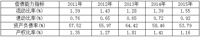 流动比率反映的是流动资产偿还流动负债的能力,也是分析短期偿债能力的最主要的指标,通常流动比率保持在2左右。流动比率与短期偿债能力呈现正相关关系。通过招股说明书得知,公司自成立以来,因业务规模逐渐扩大,由于生产所需要的原材料采购需要占用大量的资金,而公司在未上市期间其融资渠道是有限的,主要依靠的是股东的投入,引入私募以及银行借款。通过表7数据可以看出2012年流动比率有所提高但是速动比率也是有所下降的,通过前文的存货周转率也可以得出,流动比率的变化是因为存货的增多,同时在2013年中负债总额大幅度增加,查看报表得知公司所有负债全部为流动负债。其中,短期借款、应付票据、应付账款以及预收账款占比较大,主要为原材料采购。产权比率是指负债与所有者权益的比率,不仅可以反映公司的长期偿债能力也是评估资金结构合理的一种指标,从侧面表明企业的借款经营程度。通过图7可以看出,公司在2011年引入资本之后,各项偿债能力指标是有所下降的,资本结构也较为稳健,但是2013年之后指标大幅下降,公司偿债能力降低,公司有举债经营的风险,经营风险增大,说明私募股权的投资并不能完全解决公司的资金风险,公司对于流动资金的需求比较大,这也是公司IPO进行融资之后的募集资金的用途之一。并且公司的各项指标均低于同行业均值,且处于下游,公司的偿债能力在2013年增大,但是公司能够马上进行调整战略,2014年和2015年偿债能力明显好转,且超过了行业均值水平。