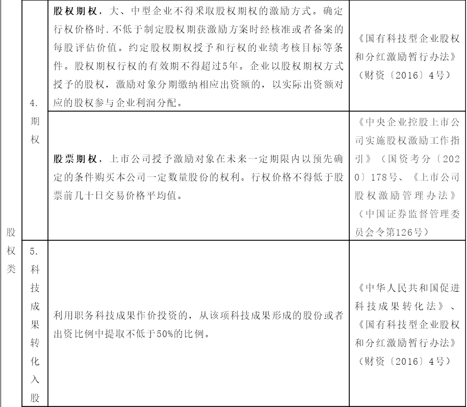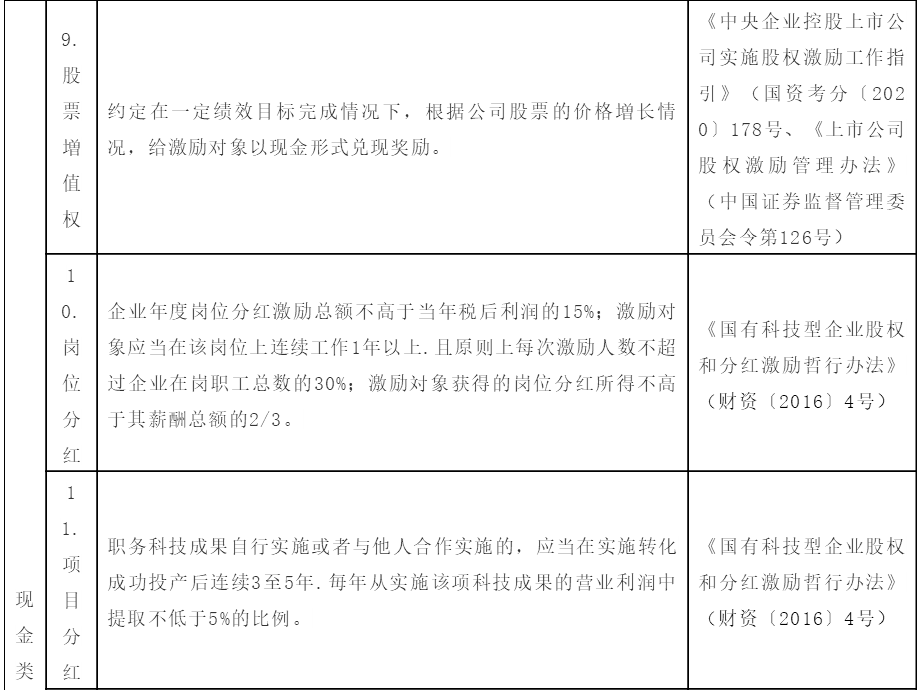根据2019年8月印发的《国务院国有企业改革领导小组办公室关于支持鼓励“双百企业”进一步加大改革创新力度有关事项的通知》(国资改办〔2019〕302号)、2019年12月印发的《百户科技型企业深化市场化改革提升自主创新能力专项行动方案》( 国企改办发〔2019〕2号),“双百企业”可以综合运用国有控股上市公司股权激励、国有科技型企业股权和分红激励、国有控股混合所有制企业员工持股等中长期激励政策,不受试点名额限制;“科改示范企业”应用足用好《国有科技型企业股权和分红激励暂行办法》(财资〔2016〕4 号)、《关于进一步做好中央企业控股上市公司股权激励工作有关事项的通知》(国资发考分规〔2019〕102 号)和国资委支持中央企业加快关键核心技术攻关若干激励政策等,大力推行股权激励、分红激励、员工持股、超额利润分享、虚拟股权、骨干员工跟投等中长期激励方式,不受相关试点的限制。根据现有政策,“双百企业”和“科改示范企业”可适用的中长期激励工具已经涵盖股权类和现金类,且可以综合运用国家出台的一系列中长期激励文件,不受试点限制,鼓励“双百企业”和“科改示范企业”先行先试、以点带面,发挥典型示范作用。