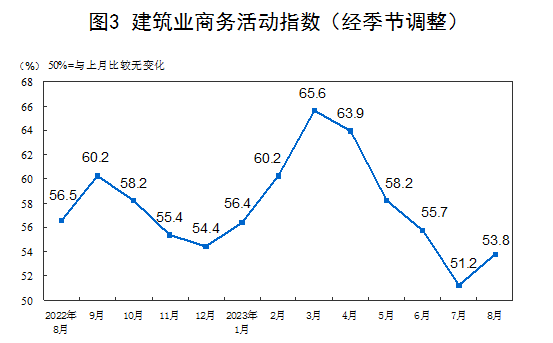 分行业看,建筑业商务活动指数为53.8%,比上月上升2.6个百分点;服务业商务活动指数为50.5%,比上月下降1.0个百分点。从行业看,铁路运输、航空运输、住宿、餐饮、电信广播电视及卫星传输服务、生态保护及公共设施管理、文化体育娱乐等行业商务活动指数位于55.0%以上较高景气区间;资本市场服务、保险、房地产等行业商务活动指数低于临界点。