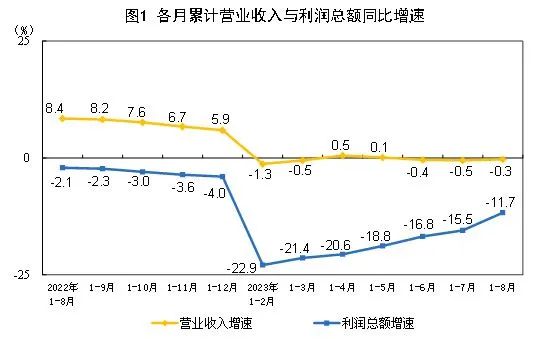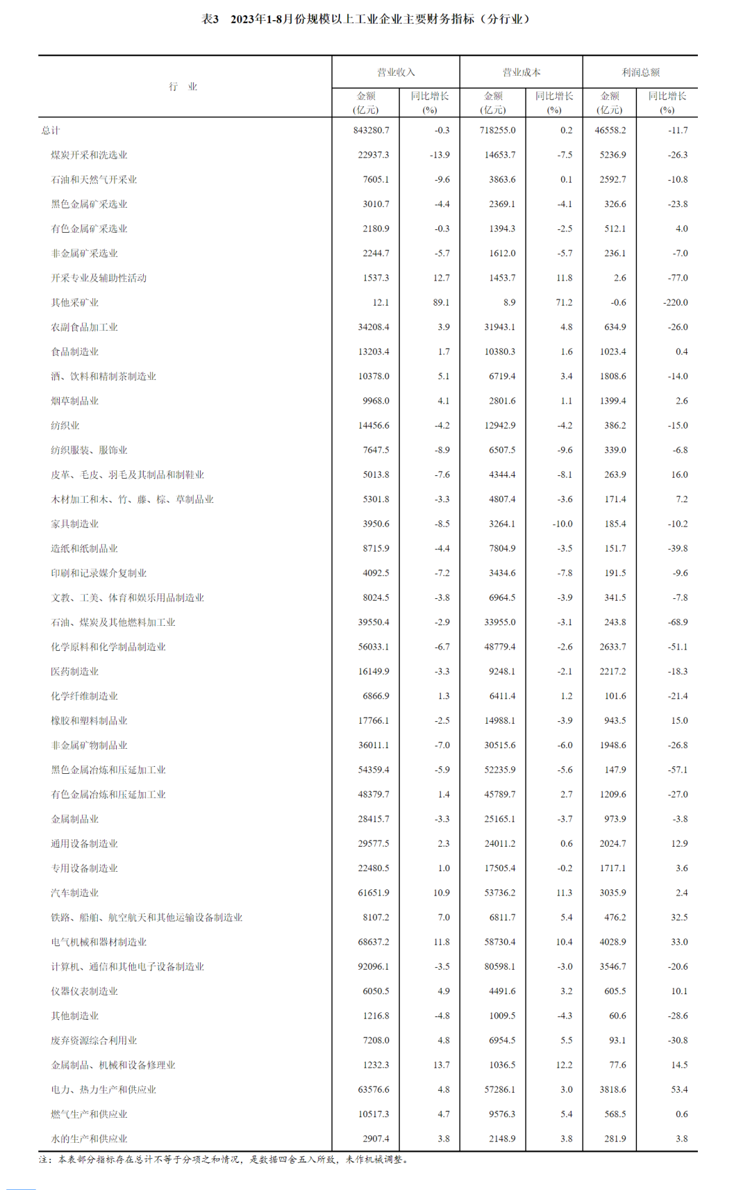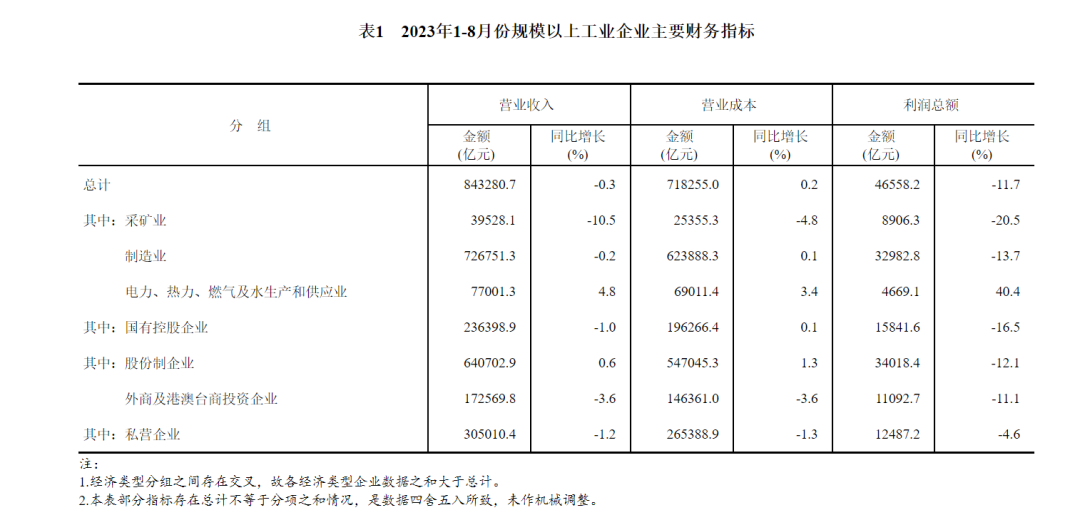 1—8月份,全国规模以上工业企业实现利润总额46558.2亿元,同比下降11.7%,降幅比1—7月份收窄3.8个百分点(按可比口径计算,详见附注二)。