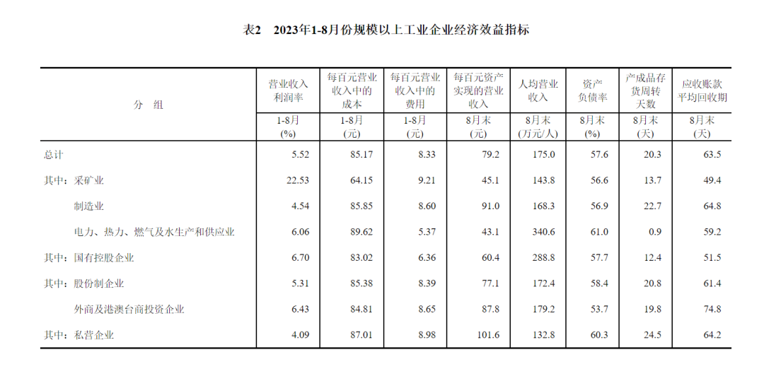 8月末,规模以上工业企业每百元资产实现的营业收入为79.2元,同比减少6.1元;人均营业收入为175.0万元,同比增加5.2万元;产成品存货周转天数为20.3天,同比增加1.2天;应收账款平均回收期为63.5天,同比增加6.0天。