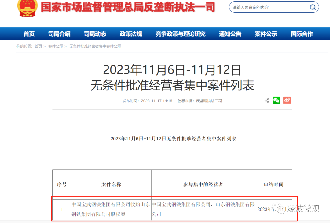 11月17日,国家市场监督管理总局反垄断执法二司公布了11月6日-11月12日无条件批准经营者集中案例。其中,“中国宝武钢铁集团有限公司收购山东钢铁集团有限公司股权案”已经于11月6日办理审结。