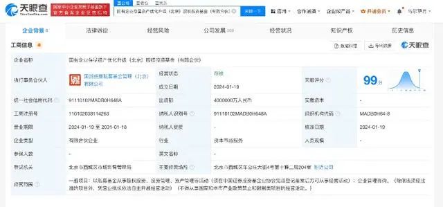 中国经济周刊-经济网讯 天眼查App显示,近日,国有企业存量资产优化升级(北京)股权投资基金(有限合伙)成立,出资额400亿人民币,经营范围为以私募基金从事股权投资、投资管理、资产管理等活动,企业管理咨询。合伙人信息显示,该基金由中国国新资产管理有限公司及旗下国新盛康私募基金管理(北京)有限公司,以及中国长城资产管理股份有限公司、中国信达(HK.01359)、中国东方资产管理股份有限公司共同出资。