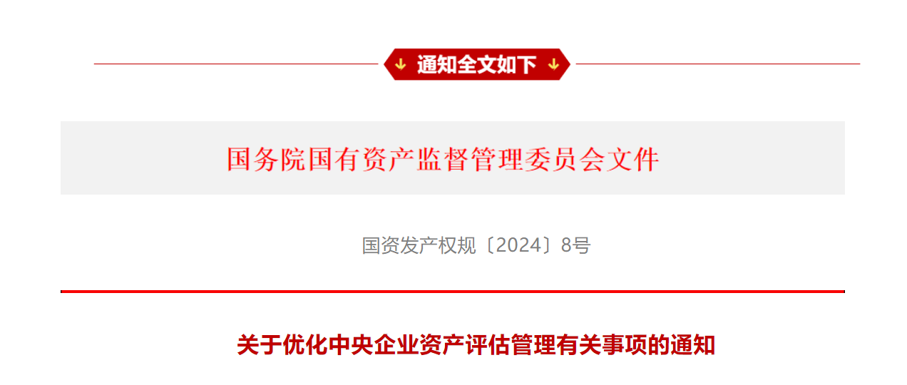 为推动中央企业布局优化和结构调整,更好适应国资国企改革发展新形势,国务院国资委近日印发了《关于优化中央企业资产评估管理有关事项的通知》(国资发产权规〔2024〕8号,以下简称《通知》)。《通知》在现行制度的原则和框架下,集中解决了一批中央企业资产评估管理工作面临的实际问题,主要包括以下内容:
